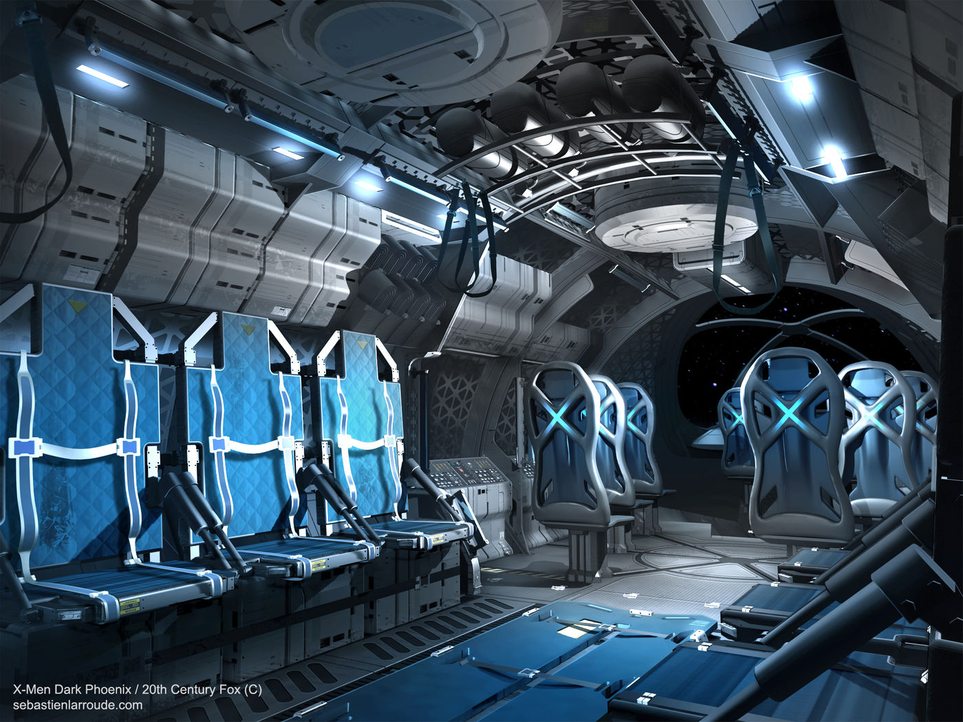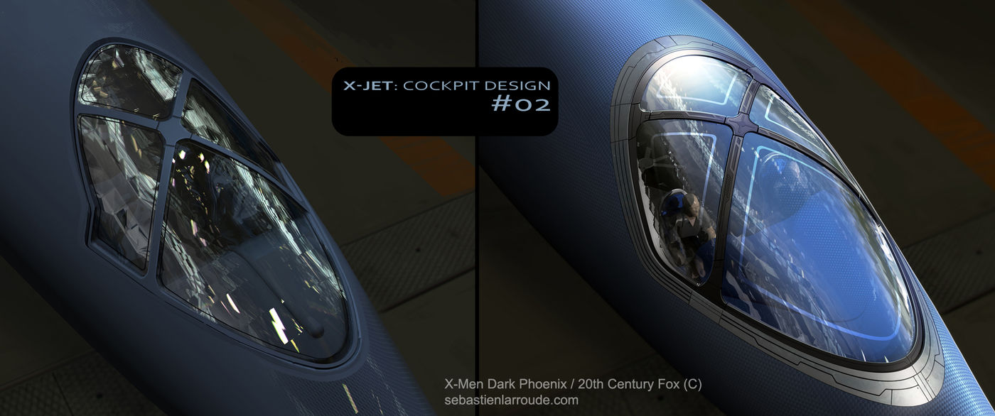What I can share today is my experience on this project and my working process instead of appealing images. One of the biggest constraints of this X-jet was its capacity to evolve in space and stay credible in terms of functionality. Therefore I quickly focused to develop a very grounded design, from the beginning to the final version. The X-jet has to be stealthy and elegant from the exterior, as if sculpted by the wind to be aerodynamic. It needed to be very functional inside, a bit military like a submarine with a flavor of do-it-yourself. So three words to start, three pillars you have to merge into one direction: elegant + military + do it yourself. Sounds challenging at first but oppositions create interesting dynamics. Also, the plane has to be iconic but respect also the older versions of the ”X-men jets. But it still challenging to find the good balance and what is acceptable for us and fans. For example, we have the ‘’X’’ pattern of the wings visible in a top view camera, the seats which recalls of bucket seat to reduce weight and aid the performance of the Jet (and these seats were not really confortables for the actors), including the cockpit and all others details which help this aspect of the design.